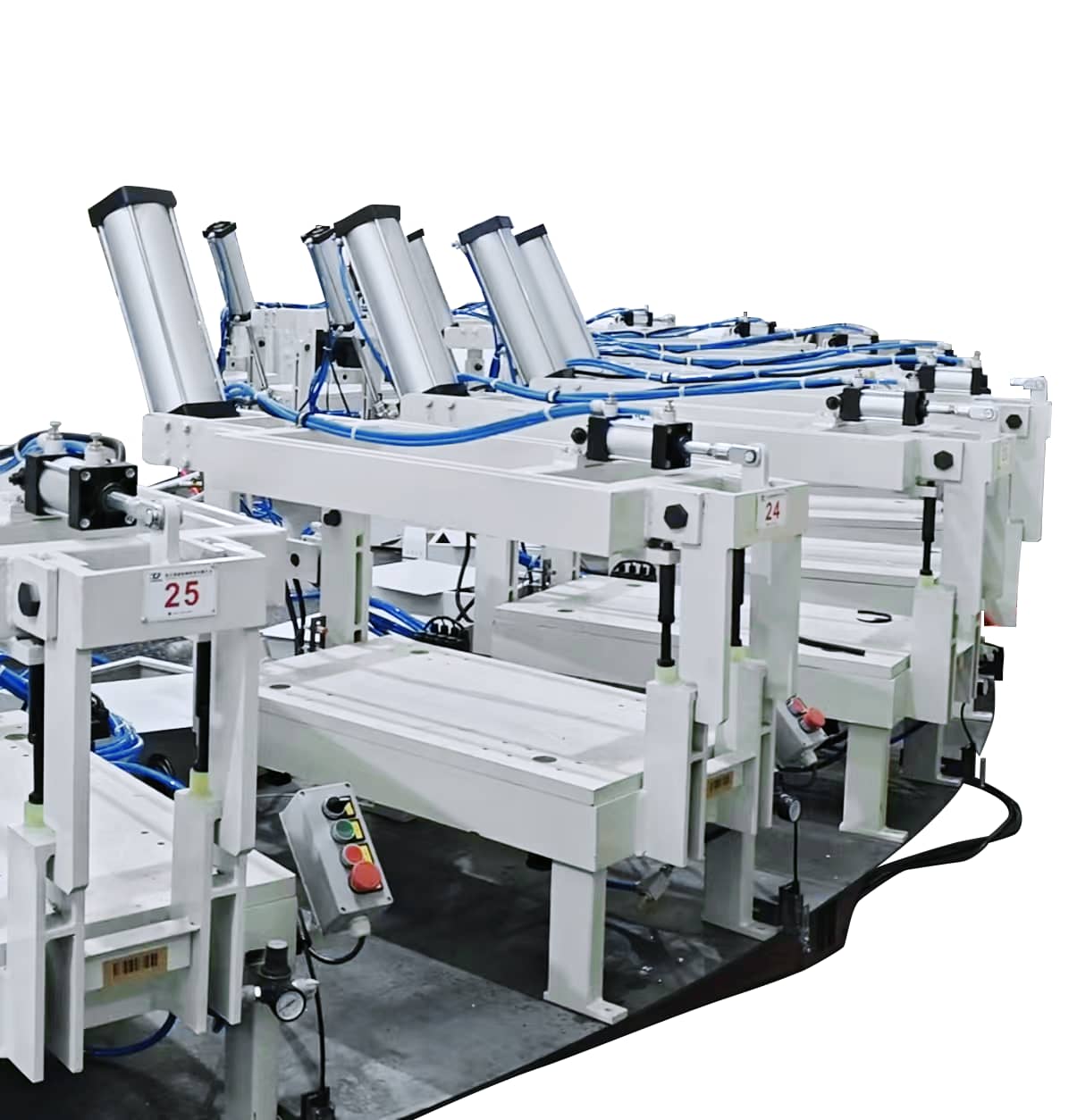 氣動模架由底座、上架、載模板、轉(zhuǎn)動銷、轉(zhuǎn)動連板、氣動回路以及控制電路構(gòu)成,采用PLC控制,由氣缸完成開合模及鎖模動作。